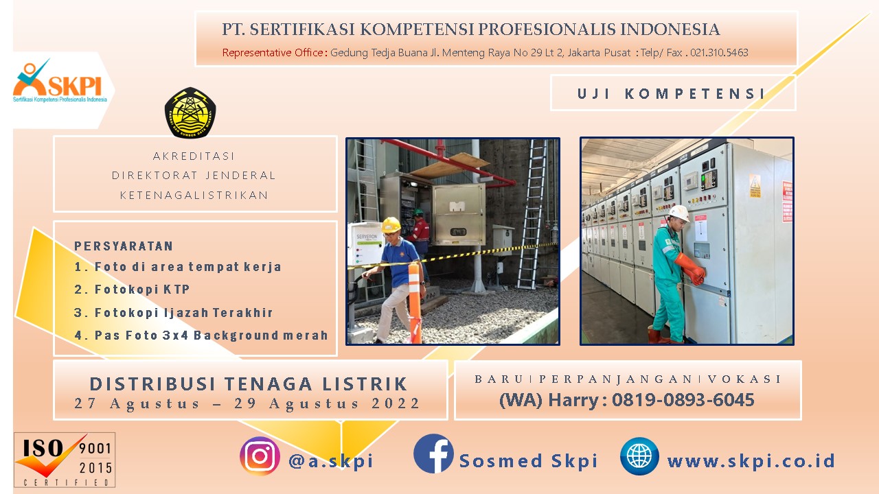 ketenagalistrikan Distribusi Listrik dibulan Agustus 2022 ini. Dengan jumlah sertifikat akreditasi 25 sertifikat , di tanggal 27 Agustus 2022 sampai dengan 29 Agustus 2022 syarat dan ketentuan bisa ditanyakan secara Langsung datang ke kantor kami atau Via Online dengan cara sebagai berikut :