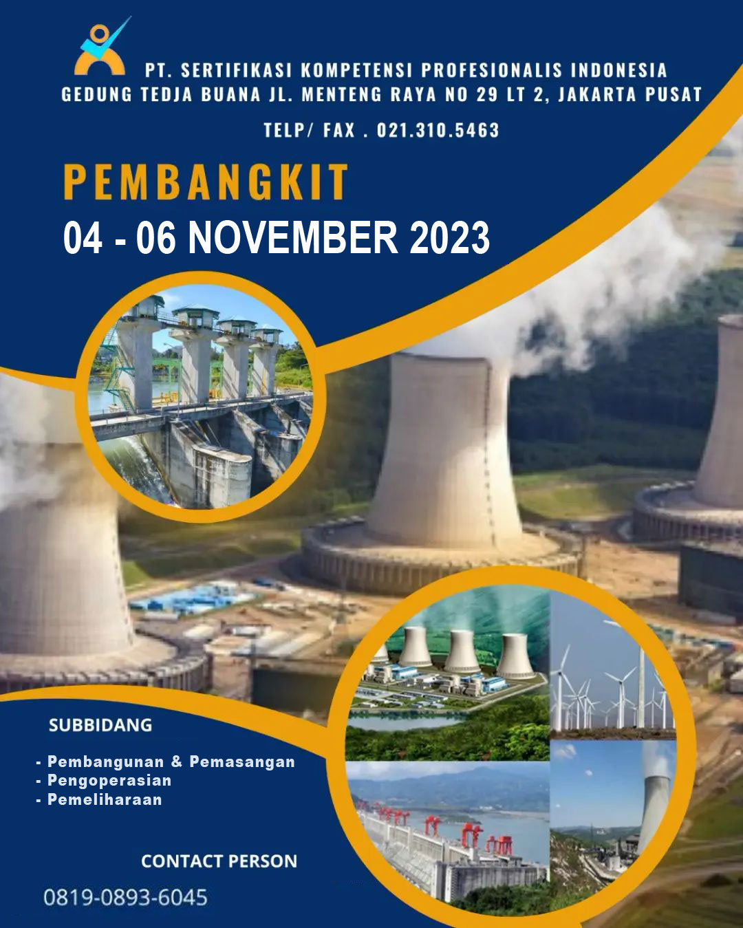 sub bidang – Pembangunan dan Pemasangan – Pengoperasian – Pemeliharaan di minggu ke 1 November 2023 ini. Dengan jumlah sertifikat akreditasi 25 sertifikat , Minggu Pertama di tanggal 04 November sampai dengan 06 November 2023,untuk informasi bisa ditanyakan secara Langsung datang ke kantor kami atau Via Online dengan cara sebagai berikut : atau info pendaftaran untuk mengikuti event berikutnya Segera daftar di form ini atau menghubungi kontak tertera di gambar